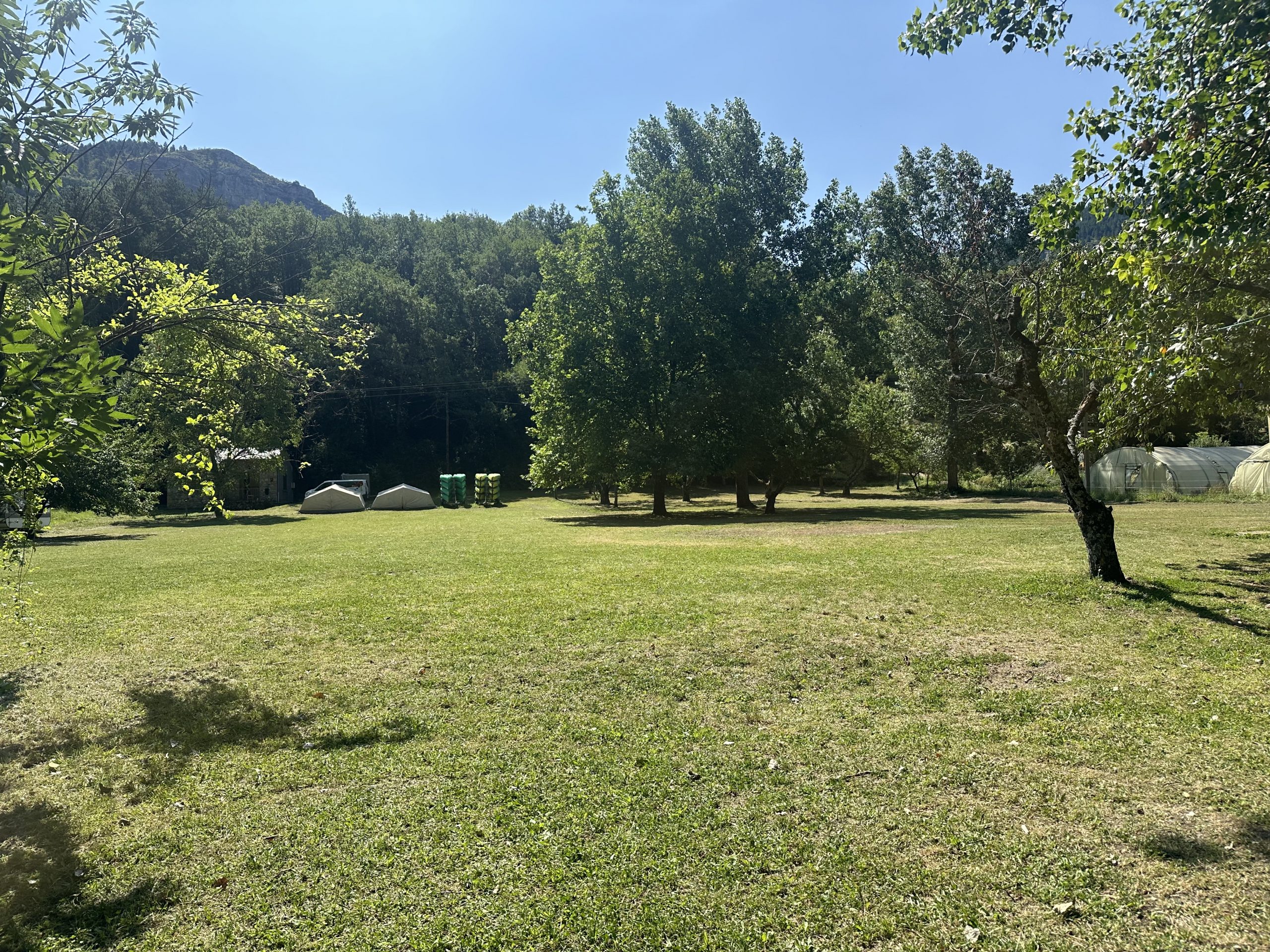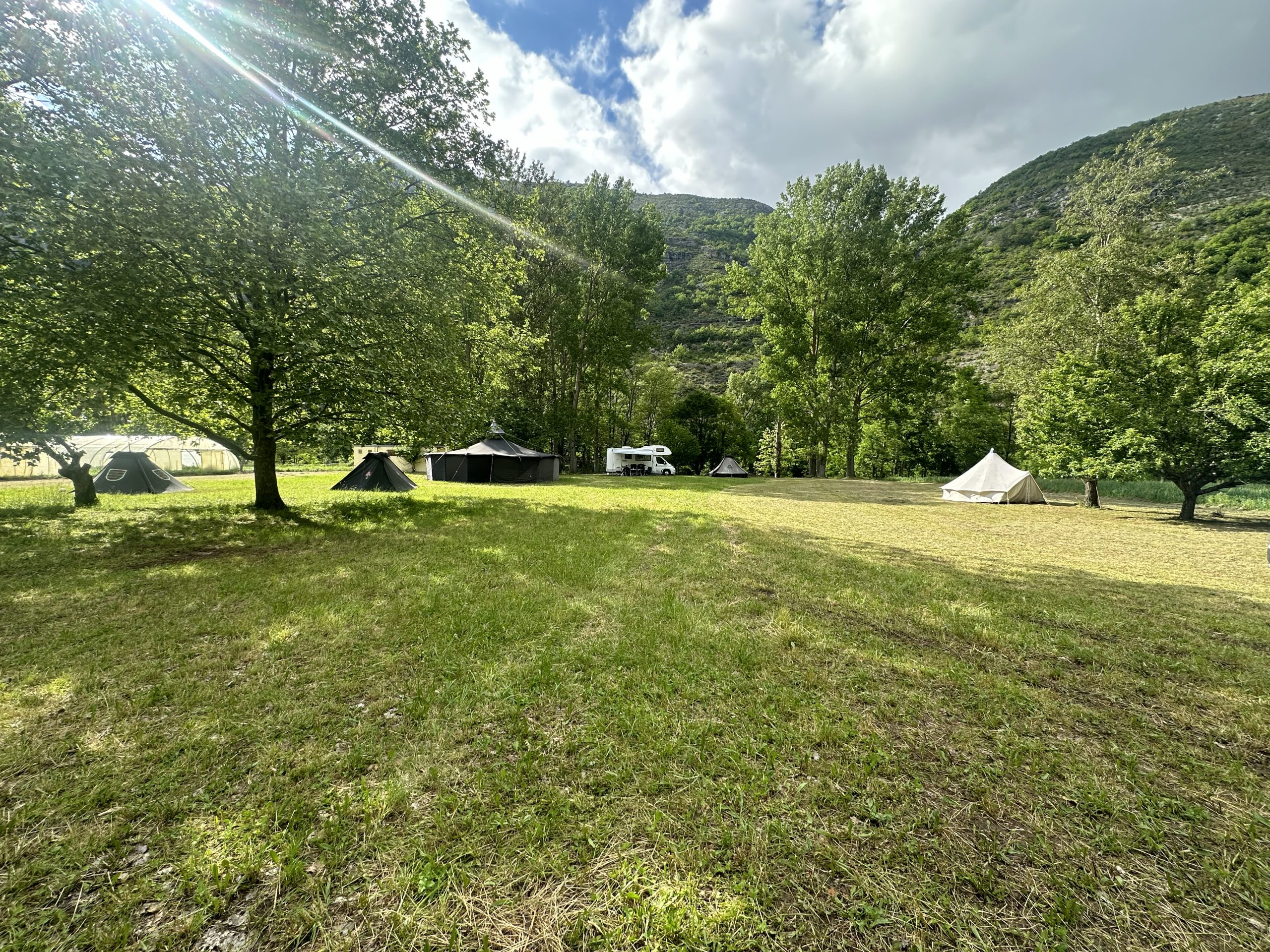Unser Zeltplatz liegt direkt am Tarn und bietet viel Raum für ein Lager inmitten der Schlucht. Zwischen Pappeln und Obstbäumen findet ihr schattige Bereiche für eure Schlafzelte, dazu offene Flächen für Aktivitäten und das Lagerleben. Die Lage am Fluss prägt den Charakter des Platzes und macht viele Unternehmungen direkt vom Lager aus möglich.