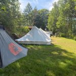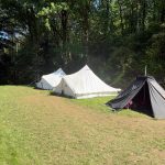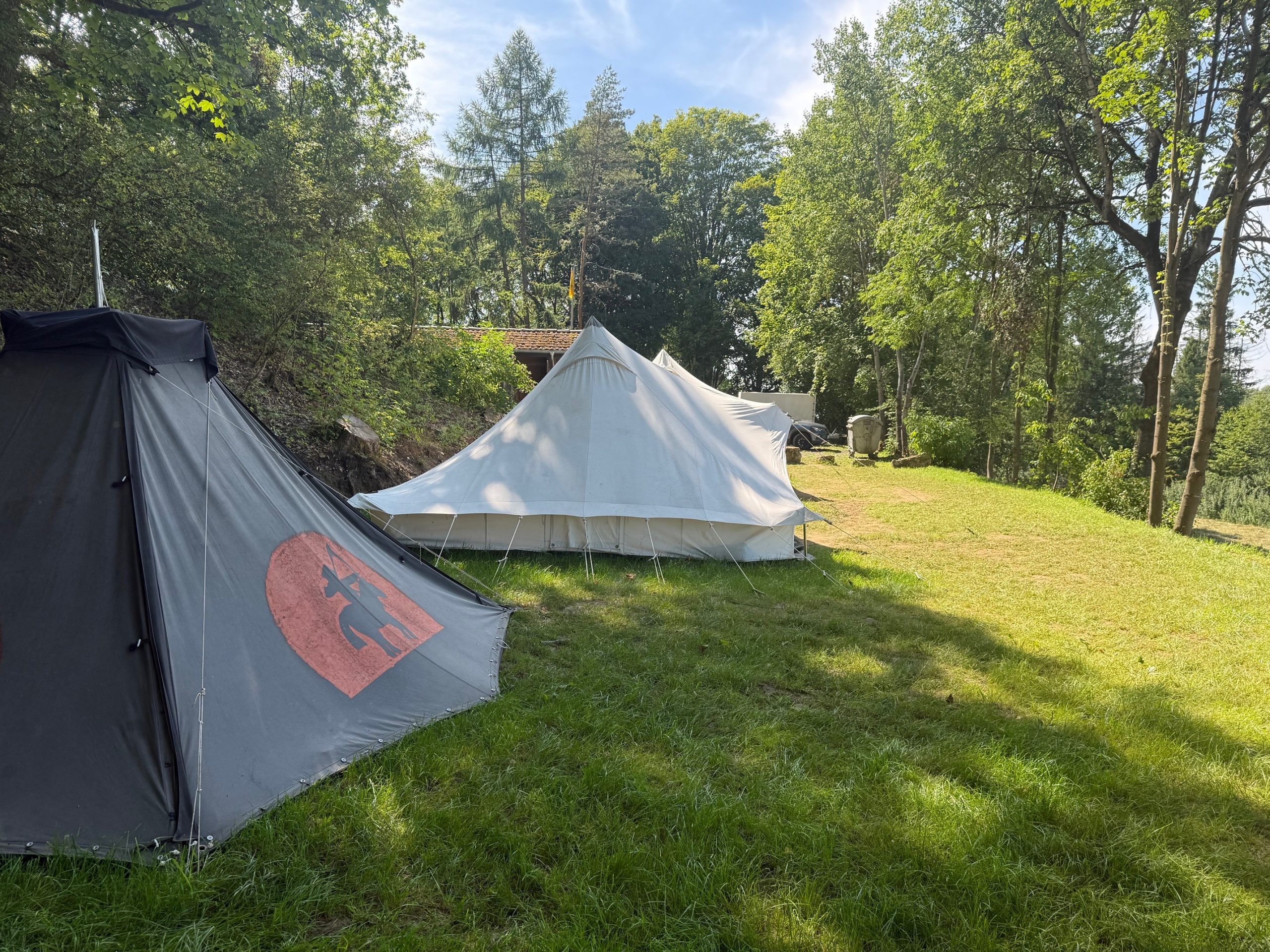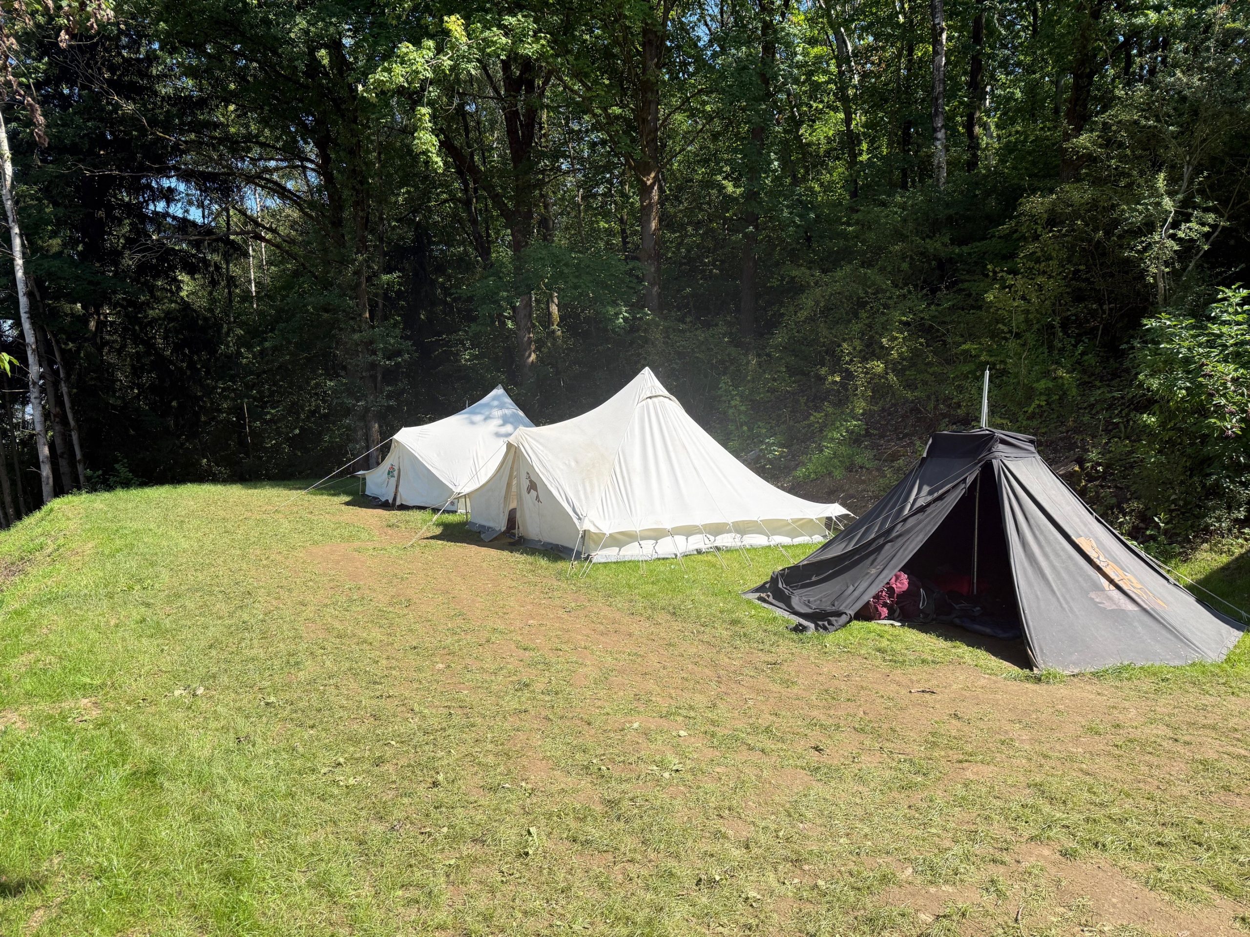Die Grünfläche im vorderen Bereich der Anlage ist zelttauglich und birgt Platz für ca. 30 Personen, gehört jedoch zu den Hütten und muss nicht einzeln gemietet werden. Im hinteren Teil des Zeltplatzes ist die gemauerte Feuerstelle – davor das Waschhäuschen mit Toiletten und Waschmöglichkeiten. Ein Fahnenmast schmückt das Gelände und durch einen geschotterten Vorplatz sind Parkgelegenheiten vorhanden.